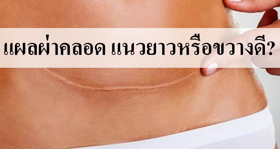 แนวแผลภายนอกจะอยู่เหนือแนวขนหัวหน่าวตามรอยขอบกางเกงใน ถ้าผ่าตัดคลอดปกติแผลจะยาวประมาณ 10-12 ซม. ลึกลงไปชั้นไขมันก็จะผ่าตามแนวขวาง พอถึงขั้นกล้ามเนื้อกลับเปลี่ยนมาผ่าในแนวตั้งเยื่อบุช่องท้องก็ผ่าตามแนวตั้ง พอถึงตัวมดลูกก็ผ่าตามแนวขวางอีกที การผ่าตัดคลอดตามขวางก็เลยดูแข็งแรงกว่าแผลตามยาว เพราะแนวของแผลในแต่ละชั้นจะแตกต่างกัน เหมือนปิดฝากล่องกระดาษที่สลับไปสลับมา ขณะที่แผลตามยาวแผลทุกชั้นจะอยู่ในแนวเดียวกัน ถ้าแผลแยกก็จะแยกหมด แต่การผ่าในแนวขวางก็จะเสียเวลามากกว่า เสียเลือดมากกว่าต้องใช้ความชำนาญมากกว่า เปิดแผลไม่ได้กว้างนัก ทำอะไรข้างในก็ลำบาก แถมขยายแผลกว้างสุดๆ ได้ไม่เกิน 14 ซม. สรุปแล้วแผลแนวขวางก็ดีกว่าในแง่ของความสวยงามกับความแข็งแรง นอกนั้นก็ไม่มีอะไรดีไปกว่าแผลตามแนวตั้งเลย
